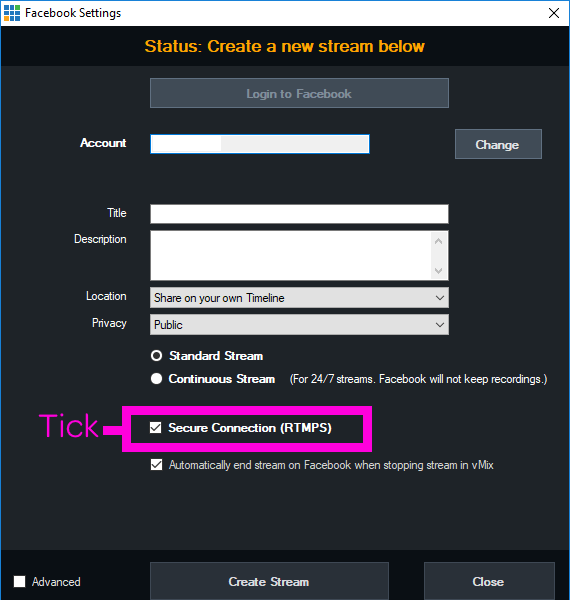 If you are using the Facebook option from the vMix Streaming Menu then the RTMPS option will be ticked by default. If you haven't made any changes to your settings for some time, just go into the settings and make sure that the box is ticked. You can see the option on the following image-