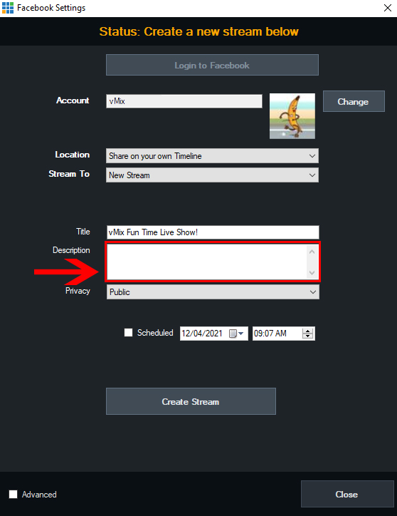 As of vMix 24 onwards, you may receive the error "Please Specify a Description" when attempting to create a Facebook Live stream in vMix.