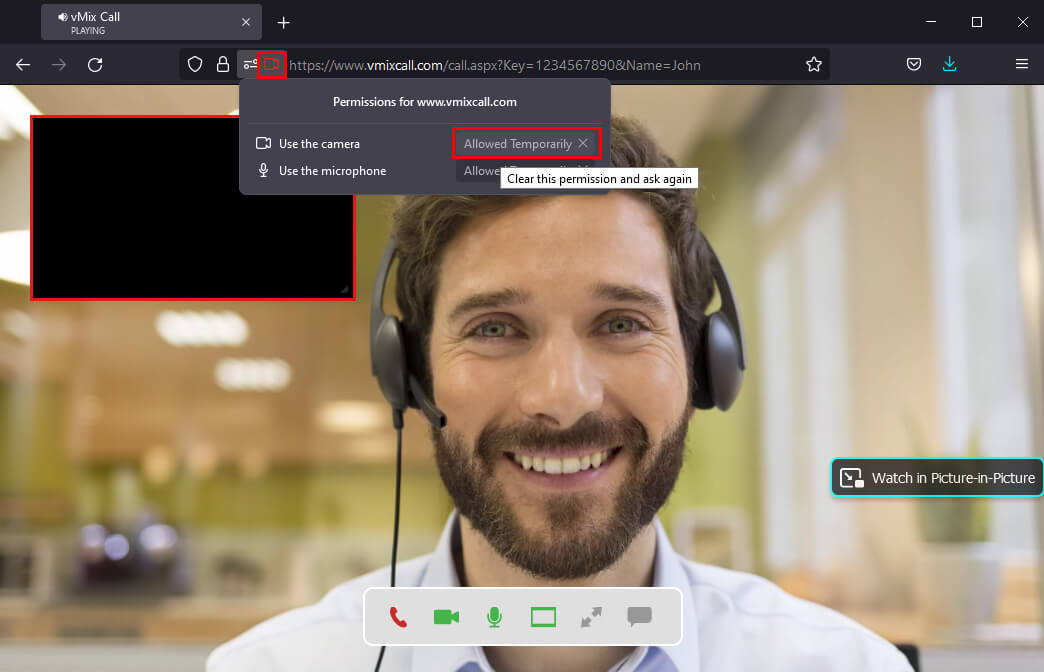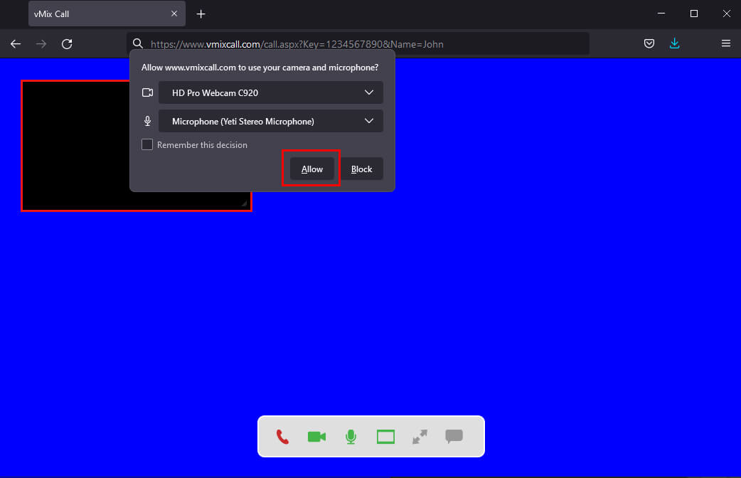 When first connecting to the call, a pop up box will appear prompting you to select your camera and microphone and allow permission. You can select the camera dropdown menu to change it. Then click Allow.