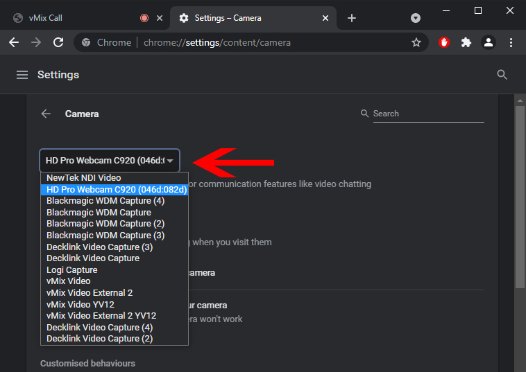 If a vMix Call guest using either PC or Mac need to change the default camera being used in the vMix Call, this can be done via the web browser settings (vmixcall.com). Or vMix Call menu settings (advanced.vmixcall.com).